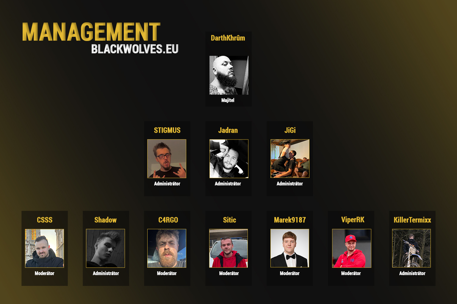 Za komunitou BlackWolves stojí tým lidí, kteří se starají o hladký chod našich herních projektů — Minecraft i Rust. Jsme hráči, správci, technici i organizátoři, které spojuje férovost, zábava a komunitní přístup. Naším cílem je vytvářet prostředí, kde se hráči cítí bezpečně, vítaně a motivovaně.